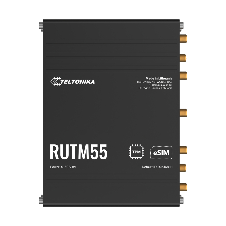 Teltonika RUTM55 – tai galingas pramoninio lygio 5G maršrutizatorius, sukurtas užtikrinti ypač greitą ir patikimą ryšį reiklioms programoms. Įrengtas 5G Sub-6 GHz modemu, palaikančiu tiek SA, tiek NSA architektūras, jis užtikrina iki 3,4 Gbps atsisiuntimo greitį ir iki 900 Mbps išsiuntimo greitį. Jis taip pat palaiko LTE Cat 19 ir 3G atsarginį ryšį, užtikrinant nepertraukiamą ryšį skirtingose tinklo aplinkose. Didesniam rezervavimui užtikrinti maršrutizatorius turi du SIM lizdus, sujungtus su integruotu eSIM. Tai leidžia automatiškai perjungti operatorius pagal signalo stiprumą, duomenų limitus, tarptinklinio ryšio sąlygas ar ryšio sutrikimus. eSIM palaiko iki 7 profilių, leidžiant centralizuotai valdyti nuotoliniu būdu be fizinio SIM keitimo.